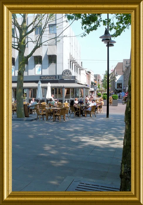 Naw kijken we vanaf de kop van de Markt de Ameidestraat in. Zoals op de foto te zien is, is het daar bij mooi weer goed toeven. Vruuger was de Ameidestraat niet zo breed. De foto werd gemaakt door Herman Waijers in 1912, toen daar net de bekende Helmondse politieagent Janus de Gouw stond.