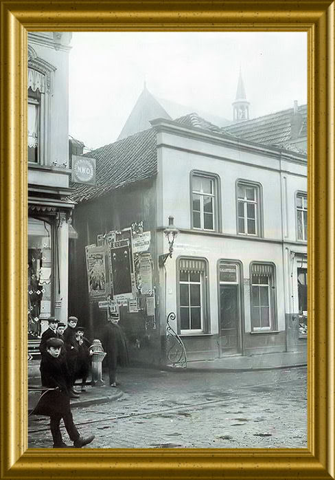 Naw kijken we vanaf de kop van de Markt de Ameidestraat in. Zoals op de foto te zien is, is het daar bij mooi weer goed toeven. Vruuger was de Ameidestraat niet zo breed. De foto werd gemaakt door Herman Waijers in 1912, toen daar net de bekende Helmondse politieagent Janus de Gouw stond.