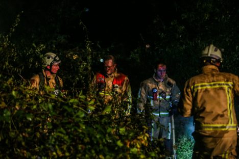 Aan de Begijnerpad in natuurgebied De Bundertjes in Helmond Noord is vanavond een houtwal in brand geraakt. Die wordt door een kraan uit elkaar getrokken zodat de brandweer die kan afblussen hetgeen nog enige tijd gaat duren.