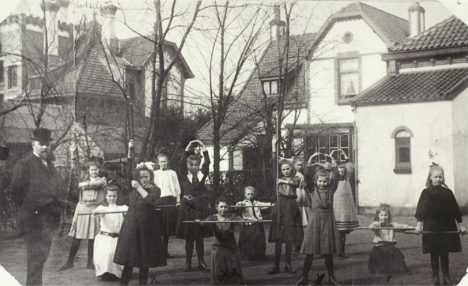 ⬇ De vrije en orde-oefeningen der gymnastiek stonden al jaren op het lesprogramma toen H. de Blouw als hoofd het echt serieus aanpakte. De meisjes kregen nu ook de gelegenheid, de uitrusting was in 1911 nog beperkt. (RHCe)