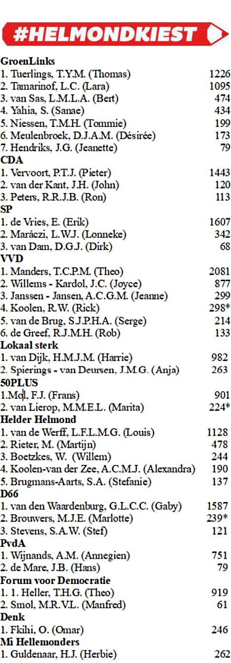 * Helder Helmond had 3 zetels na de verkiezingen in 2018, Michael Rieter splitste zich af en ging vorig jaar door als Mì Hellemonders.