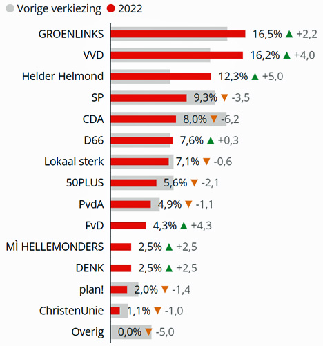 GroenLinks, op dit moment de grootste partij in de gemeenteraad, scoort het hoogste en kreeg in deze tussenstand 100 stemmen meer dan Helder Helmond.