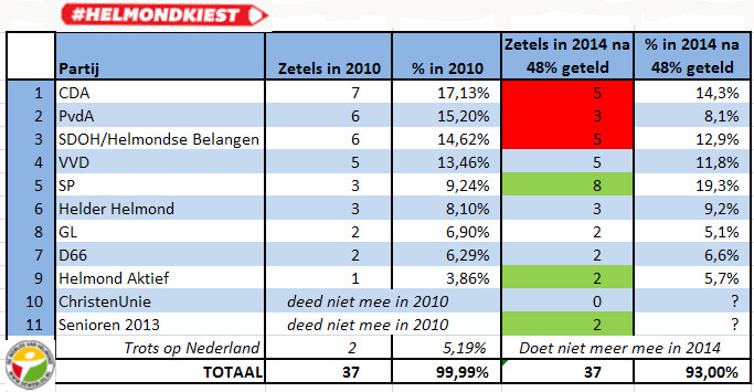 SP ( 7 ) – CDA ( 6 ) – Helder Helmond ( 3 ) – P.v.d.A ( 3 ) – Senioren ( 2 )