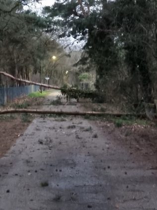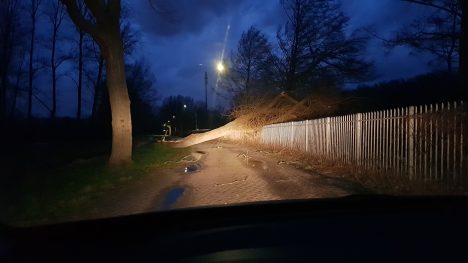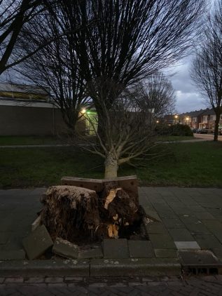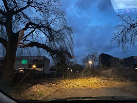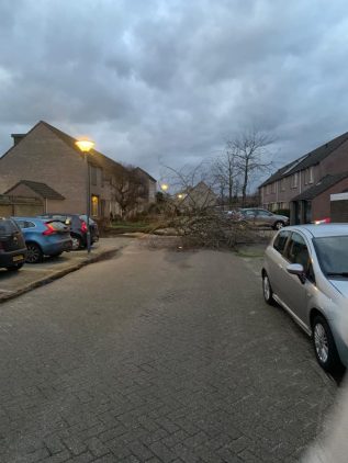De storm Eunice trekt vanaf vanmiddag ook over onze stad en zorgde inmiddels voor de eerste stormschades. Op de eerste 2 foto’s zie je de Beatrixlaan in de Binnenstad, daaronder een afgebroken verkeerslicht op de Engelseweg op het industrieterrein. De vierde foto werd gemaakt in de Professor Dondersstraat in de wijk Warande waar de boom in de top afbrak.