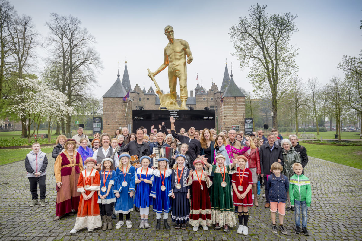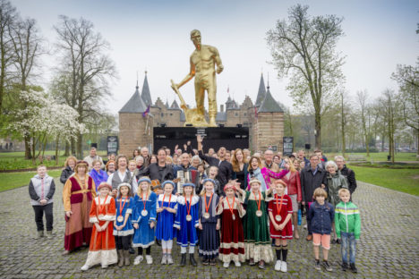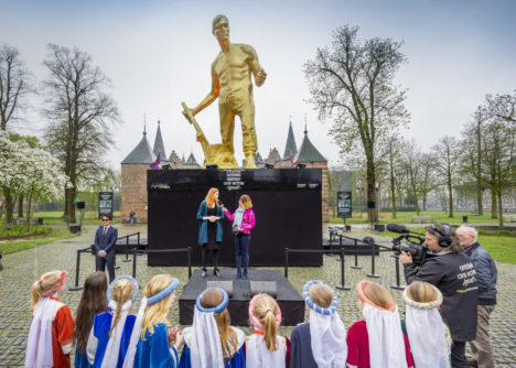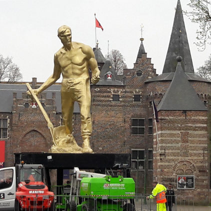 Morgenmiddag wordt een plusminus 12 meter hoog in goud gehuld beeld officieel onthuld voor het kasteel. Deze gigant die je nu al kunt zien, blijft daar tot en met zondag staan. Deze replica van het beeldje De Ploeger stond een jaar geleden op een iets lager podium op het Havenplein.
