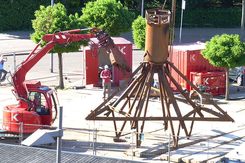 Zojuist vond een inspectie plaats van al het losgesneden staal. Het lijkt erop dat dat gelukt is en dat de stalen constructie spoedig omhoog gehesen kan worden. Bovenstaande foto werd gemaakt door Tom Verhofstad.