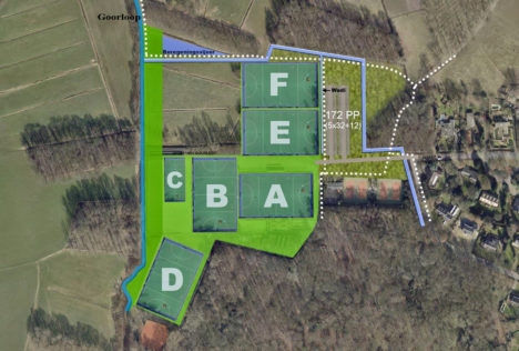 Met de uitspraak van vanochtend krijgt de al 15 jaar lopende discussie over de uitbreiding van het sportterrein van de hockeyclub (die in oktober 1178 leden had) een volgend hoofdstuk. Op onderstaand kaartje de situatie zoals die zou zijn geworden. Hockeyveld A, B en D zouden op de huidige plek blijven liggen. De uitbreiding, het vijfde veld, zou veld E worden. Tegen de velden E en F waren 172 parkeerplaatsen gepland.