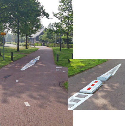 Ziet er erg gevaarlijk uit. In de avonduren moet je met een rolstoel fiets of scootmobiel die stukke breder is dan de normale fiets dan ook erg uitkijken. Lijkt me niet wenselijk op deze manier. Voor wie is dit bedoelt tegen te houden, autoverkeer ? Wat is de functie van deze drempel ?