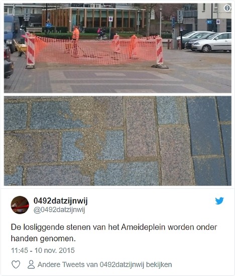 Gisteren op een feestje liet iemand Twitter-foto’s zien van de stenen en spleten op het Ameideplein. Dat wordt wel bar en boos op deze manier. Zou al iemand flink gewond zijn geraakt door het struikelen. Hoop dat ze er snel wat aan gaan doen. De winter is in aantocht en met ijs tussen die stenen zal het niet beter worden.