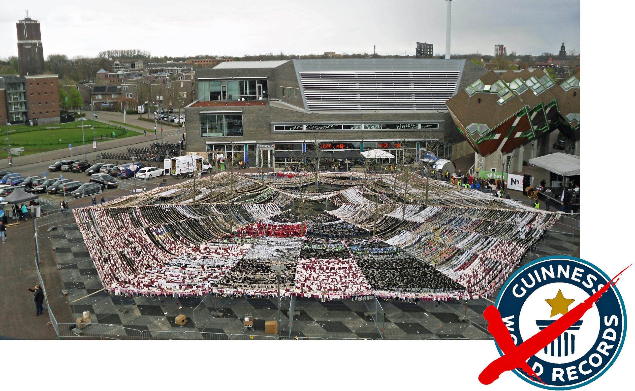 Helemaal niet erg dat ze het niet gehaald hebben. Het ging eigenlijk helemaal niet om het wereldrecord. Het was om geld in te zamelen voor de arme kinderen in Helmond. Dat heeft Tahné Kleijn zelf gezegd.