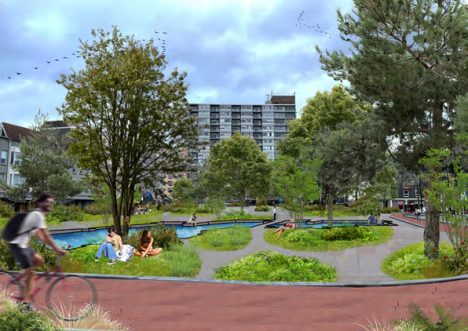 Hieronder inspiratiebeelden van respectievelijk een autovrij Ameideplein en autovrij Noord Koninginnewal uit die 53 pagina’s tellende conceptvisie.