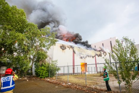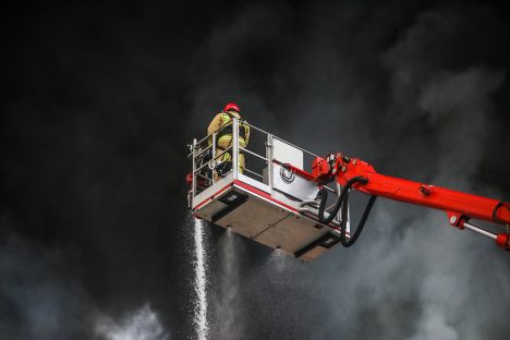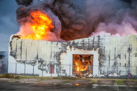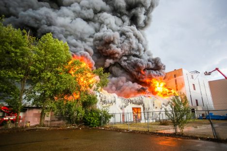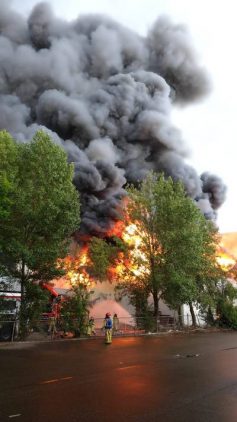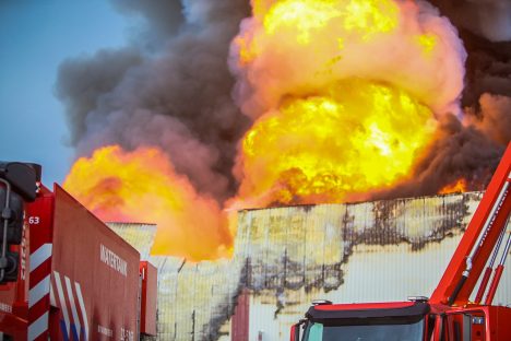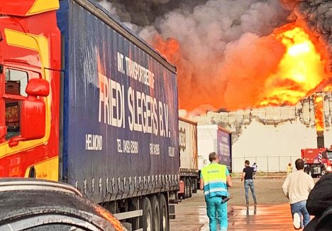 Pim verkoelen maakte de onderstaande foto’s en meldt dat de brand na een stofexplosie ontstond. Het vuur zou woeden in een voedselopslagplaats.