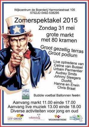 line-up: Heeeel veel!!!, 3 muziekpodia,21 livebands(o.a.van dik hout),dans,film,kunst&cultuur,sport,markt,en veel meer!!!