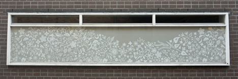 Dit brede raam zit in het pand van servicekantoor CZ Helmond. Op de Molenstraat zijn de toegangsdeuren van dit kantoor.