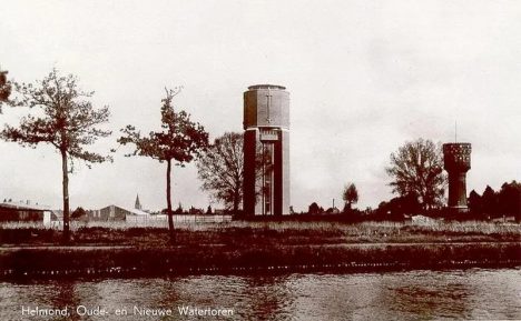 Helmond had eerst een andere watertoren. Deze oude toren, die aan de Waardstraat stond, stortte bij de ingebruikname op 10 februari 1899 in elkaar. Nadat hij herbouwd was, werd hij tot 1950 gebruikt om in het najaar van 1956 afgebroken te worden. Nu siert hij de kopfoto van deze weblog (zie helemaal bovenaan de weblog). Omdat de oude en nieuwe watertoren dus jarenlang vlak bij elkaar stonden, hebben we deze mooie foto: