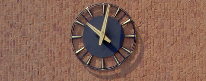 Net als 2 vragen geleden stond fotograaf José van Belkom weer in de Keizerin Marialaan. Dit keer fotografeerde zij in die straat de wijzerplaat aan het gebouw van het ROC Ter AA. Die klok hangt op onderstaande foto weer rechtop. 😉