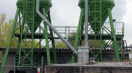 Je ziet de achterkant van het terrein van Kimmenade Nederland BV, sinds 1905 gespecialiseerd in dakbedekking. Hieronder een wat overzichtelijkere foto van die groene silo's, die worden gebruikt voor de opslag van leislag (de fijngemalen steentjes op de dabbedekking).
