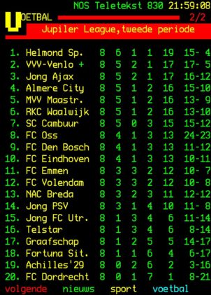 In huize Buurman staat sinds de overwinning op Jong PSV, de tv daarom de hele dag op Teletekstpagina 830/2. Ik ben nog van de generatie die zijn nieuws ’s ochtends vergaarde met behulp van Teletekstpagina 101. Eigenlijk ben ik altijd een Teletekstsupporter gebleven. Al heeft de term Teletekstsupporter bij de échte voetballiefhebber een ietwat andere betekenis; iemand die zelden of nooit in een stadion komt en de uitslagen via Teletekst volgt. Hoogstens met mooi weer en goede resultaten weten ze de poorten van het stadion te vinden.