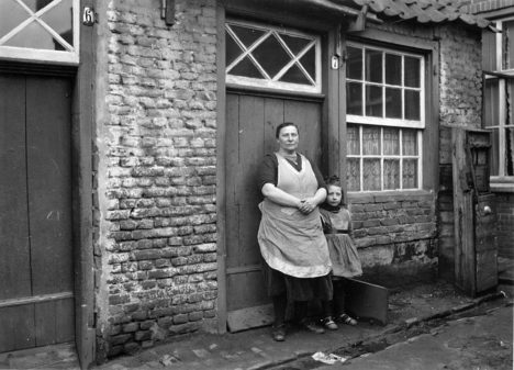 ⬆️ Woningtoestanden in het vooroorlogse Hoogeind: De nummers 6 en 7 van de 2e Beemdsteeg in 1939. Rechts de gezamenlijke pomp, vermoedelijk voor de hele rij huizen. Let ook op de bestrating: onverhard met een enkele richel parallel voorlangs de woningen. Gemiddeld vloeroppervlak van de woningen daar: 12,2 m², huur 1 gulden twintig per week. (Collectie RHCe)