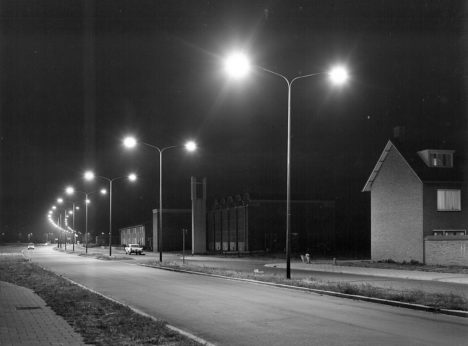 ⬇️ Het aanzicht van de nieuwe Annawijk vanuit een met Philipslampen verlichte Engelseweg, in 1959. Kerk (met de karakteristieke losstaande klokkentoren) en de nieuwe woningbouwcomplexen zijn duidelijk zichtbare tekenen van de gedaanteverandering die de wijk heeft ondergaan. (Collectie Giel van Hooff)