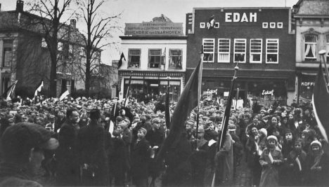Defilé van de Helmondse Schooljeugd op de Markt bij gelegenheid van de geboorte van Prinses Beatrix, op 31 maart 1938, met in op de achtergrond het pand Markt 14, waar toen de firma Van Laarhoven met winkel en werkplaats was gevestigd. (RHC Eindhoven)