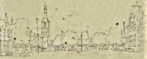 Tekening van Cornelis Pronk uit circa 1750 van de kop van de Markt, met zowel De Luts als het pand Markt 14 (links). (Rijksmuseum)