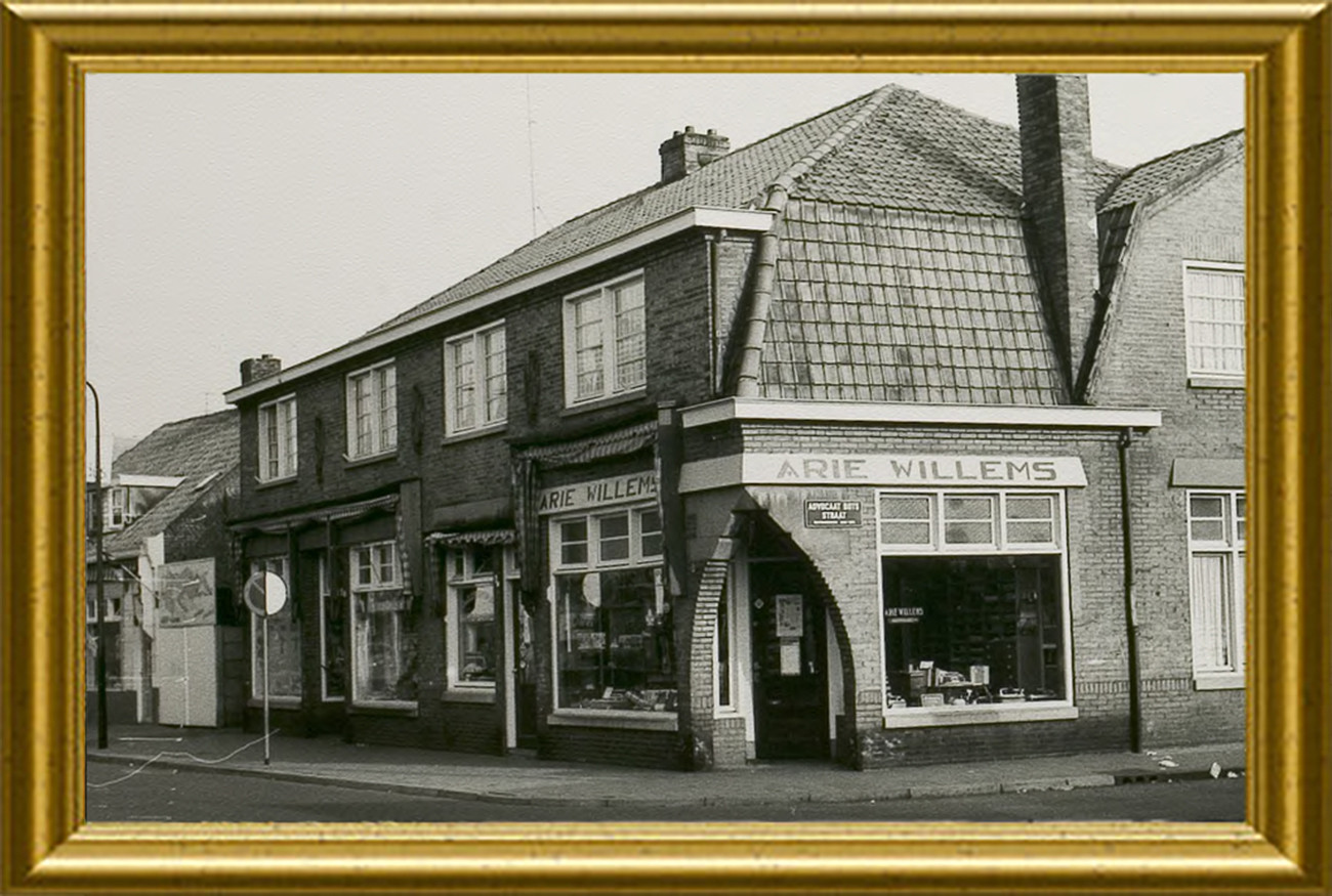 Arie en Elly Willems van Dijk trouwden op 1 mei 1956. Kort erna kochten zij het pand op de hoek van de Heistraat en Advocaat Botsstraat. Daarin kwam hun winkel annex woning. Arie gaf toen al les aan het conservatorium in Amsterdam en Elly ging de muziekwinkel exploiteren. Op die plek zit Naw Vullings Kappers. De Vruuger-foto werd gemaakt in 1959.