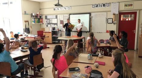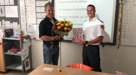 Vanochtend werd het 100.000ste lesboekje Brandweer op School feestelijk uitgereikt bij groep 7a van Basisschool ‘De Rank’. Meester Arjan Haak ontving dat exemplaar met een bos bloemen van 2 brandweermannen die daarvoor naar zijn klaslokaal op de Abdijlaan in Helmond Noord waren gekomen.