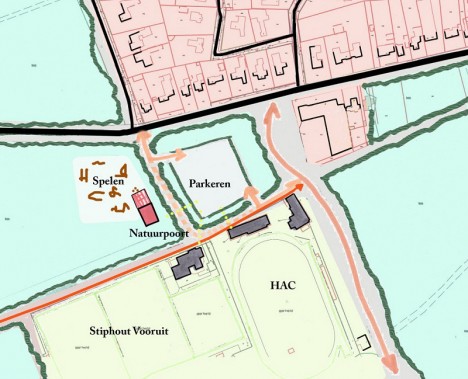 Vlakbij de sportterreinen van Stiphout Vooruit en HAC komt een natuurpoort, een soort startpunt als je de Stiphoutse bossen ingaat. Een plek met een horecavoorziening (oppervlakte maximaal 500 m²) zal daar verrijzen met bijvoorbeeld een speeltuintje, dierenweide of touwparcours. Er zal informatie over de natuur en routes verkrijgbaar zijn en er wordt een openbare parkeergelegenheid voor zo’n 150 tot 170 auto’s aangelegd.