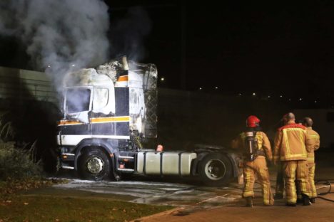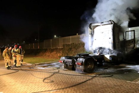 Er is niemand bij de brand gewond geraakt. De vrachtwagen wordt door een bergingsbedrijf weggesleept.