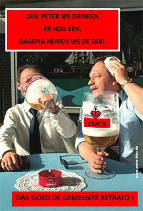 Zo, dan ben je een waardeloze verliezer. Zaterdag werd bekend dat Helmondse wethouder Peter Tielemans zich jarenlang op kosten van de gemeenschap van en naar de kroeg liet taxiën. En daarom heeft zijn fusiecombinatiemixpartij SDOH-D66-Helmondse Belangen gelijk de stekker uit de hele Helmondse coalitie getrokken. Wegens boehoehoe jullie zijn stom. SDOH-D66-Helmondse Belangen vindt dat de wethouder voor schut is gezet, terwijl hij binnen de regels heeft gehandeld. Fractievoorzitter Berry Smits: “HET VERTROUWEN IS WEG.” WTF? Prima alsook uitstekend dat meneer Pielemans zijn dubieuze dubbelleven als wethouder en oplichter opgeeft nu hij in opspraak is geraakt. Maar dat zo’n coalitieclubje dan wraak neemt door iedereen uit z’n functie te duwen, is wel extreem kinderachtig. Heel Helmond moet nu lijden onder het quasicriminele gedrag van één wethouder die niet met zijn fikken uit de koektrommel kon blijven. Alleen maar omdat Tielemans ‘zich niet heeft kunnen verdedigen’. Wat de neuk viel er te verdedigen dan? Hield hij altijd belangwekkend topoverleg met de plaatselijke middenstand in de kroeg? Zat-ie midden in de nacht belangrijke bouwplannen te bestuderen die over het biljart lagen uitgespreid? Kon-ie beter tot politieke beslissingen komen na acht jenevertjes? Nu komt er meteen een flinke schep onnodige kosten aan wachtgeld + verkiezingen + stilstaande projecten + bestuurlijke chaos van een complete coalitie bovenop die paar taxibonnetjes van 1 oplichter. Tielemans, bedankt. Droplul.