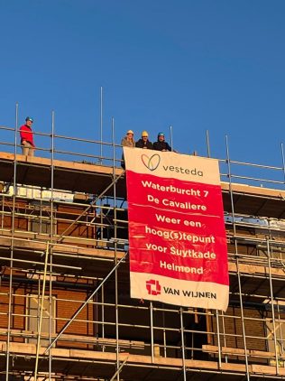 Graag neem ik jullie eerst mee naar afgelopen maandagmiddag. Het was, zoals de hele week, behoorlijk koud, maar dat mocht de pret niet drukken. We stonden bovenop de volgende Waterburcht in het kanaal. Die heet nu nog W7, maar gaat De Cavaliere heten als die klaar is. Van Wijnen heeft namelijk het hoogste punt bereikt. Daarmee is Suytkade bijna klaar. In de nieuwe Waterburcht komen 70 nieuwe appartementen. Deze komen in de vrije sector huur. Eerder hebben we al veel sociale huur in het gebied toegevoegd, én koop, dus we vonden het een goed idee om ook middeldure en ook wat duurdere huurappartementen toe te voegen. Het is belangrijk om een mix aan woningtypes in de wijk te bouwen, zodat er plek is voor iedereen. Immers: je woont heerlijk op Suytkade. Met water en groen in de buurt, dichtbij het station en vlakbij de binnenstad. Ik ben trots op dit prachtige gebied. Hopelijk kunnen we aan weerszijden van Suytkade ook verder gaan ontwikkelen: voor het Stationsgebied en voor Houtsdonk komen er in 2023 mooie plannen aan!