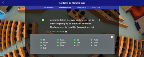 De door Michiel van Geel genoemde motie over het verbeteren van deze dienstregeling is vanmiddag met algemene stemmen in de Tweede Kamer aangenomen.