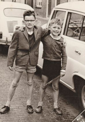 Tussen de prachtige artikelen en plaatjes uit het (recente) Helmondse verleden, kwam ik een foto tegen van twee mennekes. Knaapjes van een jaar of zeven, acht, denk ik. Allebei in een korte broek zodat hun blote benen prominent tevoorschijn komen. Dat zie je tegenwoordig niet meer. De langste van de twee draagt een veel te groot colbertje en de andere een jack of een trui. Dat is niet zo duidelijk te zien. De jongetjes zijn gezworen kameraden en laten dat blijken. Ze zijn stevig gearmd en daar komt niemand tussen, lijkt het. In het hoekje van de foto is bijna een jaartal te herkennen. Ergens augustus in ’52 of ’62.