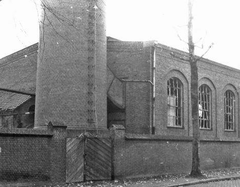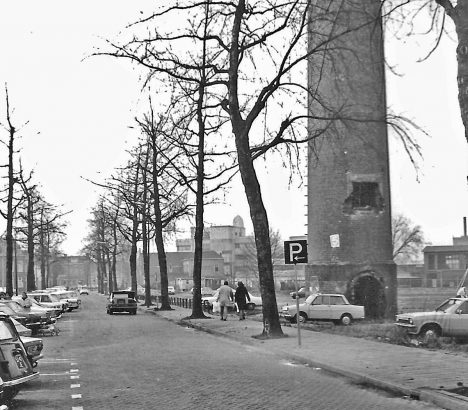 De 50 meter hoge schoorsteen van Ramaer kwam na een zestig jaar, in 1973, akelig alleen te staan. Op twee foto’s zien we hem nog met het bijbehorende bebouwing, met onder meer de betonbouw uit 1911, die een herbestemming tot ontmoetingscentrum qua constructie in ieder geval wel kon verdragen. Op de andere foto is het verband met het ketelhuis goed te zien: hier wordt in stoomketels stoom geproduceerd. De relatief bescheiden fabrieksmuur is op de derde foto, met de overige bebouwing, verdwenen, de schorsteen is al ontdekt als blikvanger door de plakploeg van lijst 5, de CPN. (Collectie Giel van Hooff)
