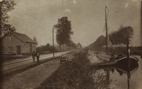 Een familiekiekje van de textielondernemers De Wit bij de Zuid-Willemsvaart. In het roeibootje de pater familias en oudste Piet de Wit en op het jaagpad zittend twee van zijn broers (vermoedelijk Willem en Theo), eind 19e eeuw, vlakbij hun woonstede huize ‘Karelstein’. We kijken op de Kanaaldijk N.W. in de richting ‘Aarle-Rixtel’, iets ten zuiden van Sluis 7, waarvan rechts achteraan de sluiswachterswoning zichtbaar is. (Regionaal Historisch Centrum Eindhoven)