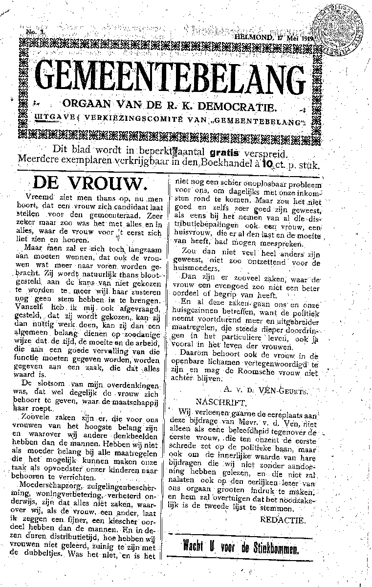 De plaatselijke afdeling van de Bond voor Vrouwenkiesrecht was, voor zover bekend, best wel actief, maar bereikte slechts een zeer beperkt deel van de doelgroep, lijkt het. De drijvende kracht erachter was de echtgenote van de progressief-liberale ondernemer Jan Benjamin Kam, Mina Kruseman, eerder bij de Gist- en Spiritusfabriek te Delft werkzaam geweest als een van de eerste maatschappelijk werkers. Het lijkt dan ook niet helemaal toeval dat haar schoondochter in 1940 het tweede vrouwelijke raadslid in Helmond werd. Al eerder, bij de eerste verkiezingen waar algemeen passief en actief kiesrecht gold en er dus ook op een vrouw gestemd kon worden, de gemeenteraadsverkiezingen van 19 mei 1919, werd een vrouw in de raad gekozen. Het politieke landschap in Helmond (met een 20.000 inwoners) was nog zeer overzichtelijk: Naast twee katholieke lijsten was er nog plaats voor de lijst Niet-Katholieken waarvan de ‘natuurlijke’ achterban net voldoende groot was om een enkele zetel in de wacht te slepen, bezet door de al genoemde Kam. De overige 14 zetels werden verdeeld door de twee katholieke lijsten waar Recht door Plicht tegenover Gemeentebelangen stond. De eerste lijst was van de traditie en het establishment, die van Gemeentebelangen (onder leiding van Jacobus Ebben en Jos. Van Wel) was meer van het gewone volk. En het lijkt dan ook geen toeval dat de enige vrouwelijke kandidaat hier een plaats had gekregen, zij het dat zij zeven mannen voor moest laten gaan. Maar de verkiezingen waren een succes voor Gemeentebelangen die met acht raadsleden, zeven man en dus een vrouw, de absolute meerderheid in de raad kregen.