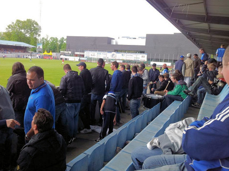Vak met de echte fans van Helmond Sport loopt langzaamaan vol. En het geluid gaat daar vol open.