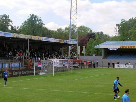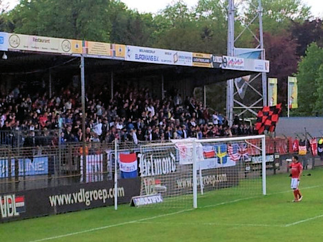 De spelers van Helmond kwamen na de thee als laatste het veld op. Met de eigen fans die letterlijk achter ze staan:
