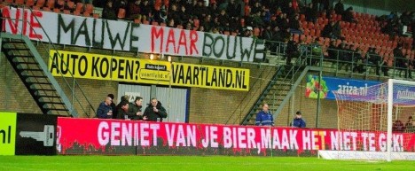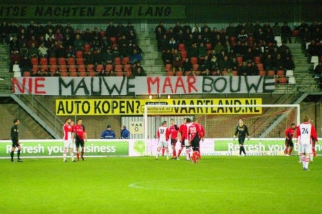 Met een groot spandoek met daarop Nie mauwe maar bouwe lieten de supporters van Helmond Sport gisteravond duidelijk weten wat zij vinden van de perikelen omtrent het nieuwe stadion. Hun spandoek hing achter het doel tijdens de gewonnen thuiswedstrijd tegen FC Emmen.