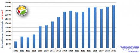 Die vraag verbaasde ons toen we die de eerste keren hoorden. Want de meeste van hen komen met regelmaat even langs en onze statistieken melden we sinds jaar en dag in de kolom links. Die zie je dan toch? Maar na een tijdje realiseerde we ons dat het grootste deel die kolom niet meer ziet omdat ze via hun smartphone kijken. Daarom hieronder een staafdiagram met het gemiddelde aantal unieke bezoekers per maand sinds de start in 2005.