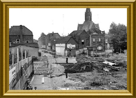 Naw zie je de Kasteel-Traverse. Vruuger (1964) werd die aangelegd dwars door straten en huizen, zoals hier door de Kamstraat. Op 2 september 1966 werd ‘de luchtbrug over de Zuid-Willemsvaart’ officieel geopend. Sinds 1951 was er over gepraat en er werden ruim 7 duizend bezwaren tegen ingediend. De kerk van de Nederlands-hervormde Gemeente aan de Kerkstraat stond er toen ook al.