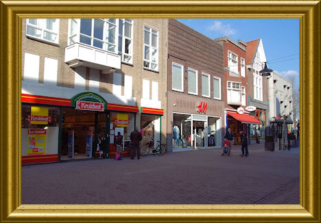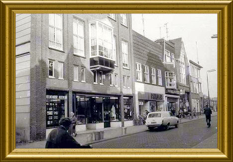 Naw de Veestraat deels in het zonnetje. Vruuger (1964) was het toch anders. Toen had deze winkelstraat eenrichtingsverkeer waar nog mocht worden gefietst. De ijzeren vuilnisemmers netjes aan de straat geeft een aardig tijdsbeeld.