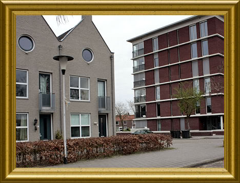 Naw zie je aan de linker kant 2 van de 7 woningen aan De Burcht, een straat aan het spoor. De architectuur van die woningen in ’t Haagje is geïnspireerd op de oude bouw. Vruuger (1949) werd die oude bouw nieuw gebouwd.