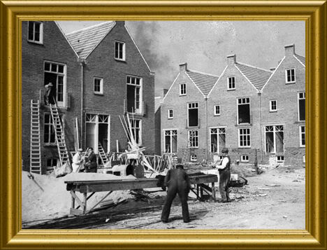 Naw zie je aan de linker kant 2 van de 7 woningen aan De Burcht, een straat aan het spoor. De architectuur van die woningen in ’t Haagje is geïnspireerd op de oude bouw. Vruuger (1949) werd die oude bouw nieuw gebouwd.