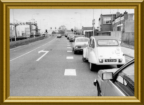 Naw zie je de Kanaaldijk Noord-West richting sluis 8 met links 2 bruggen voor het verkeer. Rechts, achter het groen, staan woningen van De Vloet.