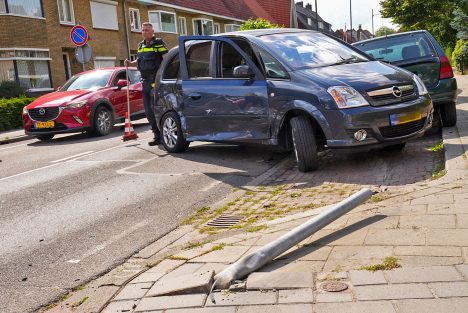 Kort voor half 5 vanmiddag zijn 2 auto’s met elkaar in botsing gekomen bij een kruising op de Eikendreef. Van die personenauto’s is er eentje tegen een verkeersbord gereden waardoor dat afbrak. Daarna reed het voertuig tegen een geparkeerde auto. Die klap veroorzaakte een kettingreactie, waardoor nog 2 geparkeerde auto’s beschadigd raakten.
