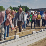 Vanmiddag werd de eerste duurzame steen, Clickbrick, gelegd door wethouder Gaby van den Waardenburg. Zij werd daarbij geholpen door Paul Terwisscha van Woonbedrijf (links) en Arno van Tilburg, directeur van Stam + De Koning Bouw (rechts).