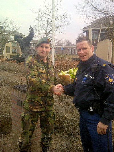 Vandaag ging wijkagent Marco van Bree naar Weert om deze militair met een bloemetje te bedanken. “Een mooi praktijk voorbeeld van de samenwerking tussen twee overheidsinstellingen” aldus de wijkagent.