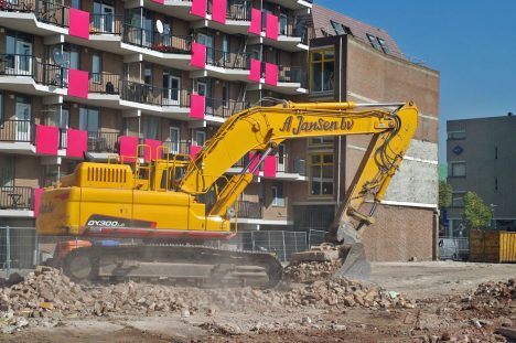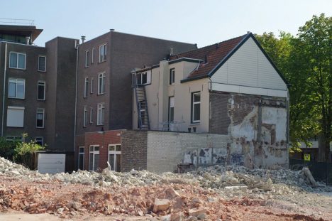 Op de plek waar de 44 sociale huurappartementen komen, zie je nu tijdelijk de achterzijde van de flats aan de Kasteel-Traverse. Wim van den Broek maakte de eerste 4 foto’s van de bouwplaats vanaf de Kerkstraat Zuid, op de achtergrond van zijn eerste 2 foto’s zie je het politiebureau.